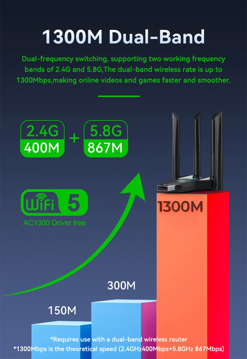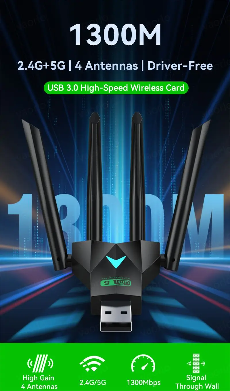 Adaptador WiFi USB 3.0 Dual Band 1300Mbps VAORLO - Dongle 4 Antenas 2.4G/5G, 802.11ac, Plug and Play, para PC e Portátil