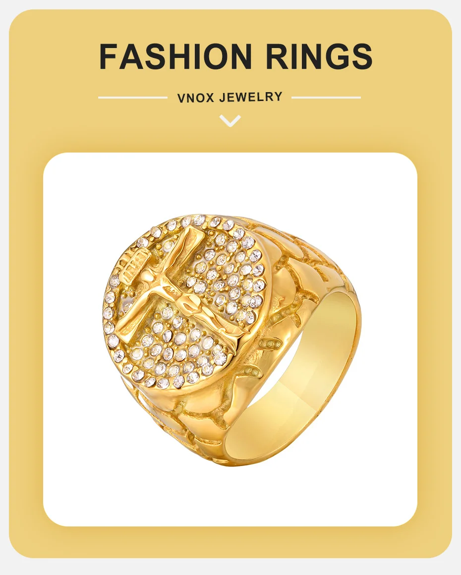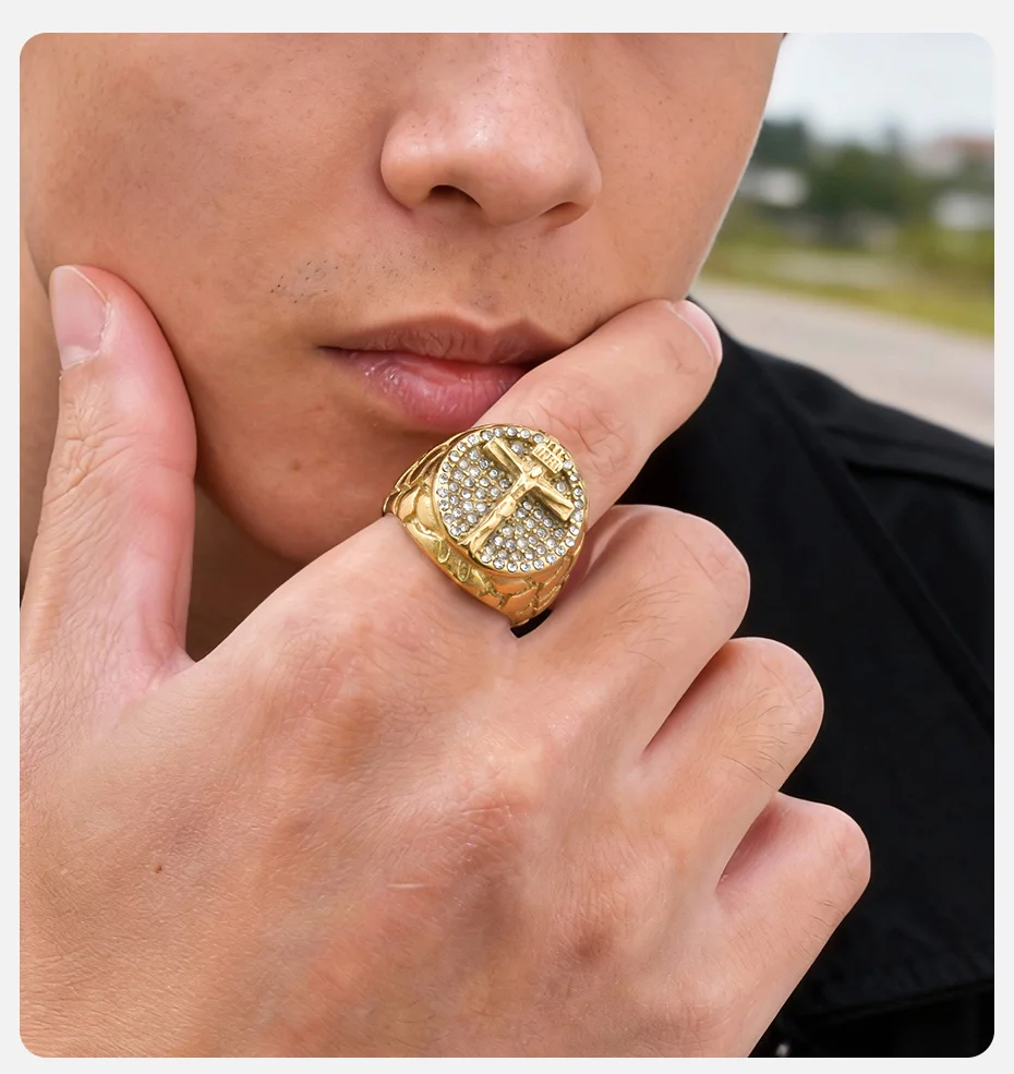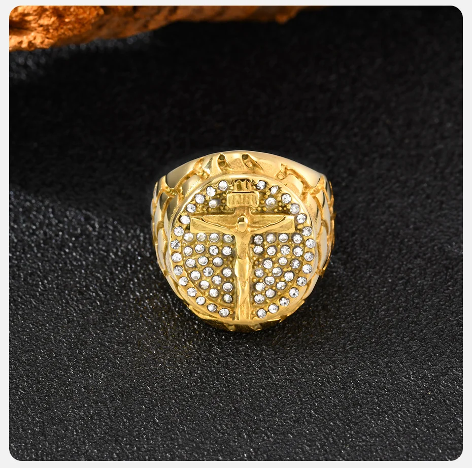 Anel Cruz para Homem com Zircónia Cúbica | Aço Inoxidável Banho a Ouro 18K, Tamanhos 7-12 | Presente Religioso Cristão