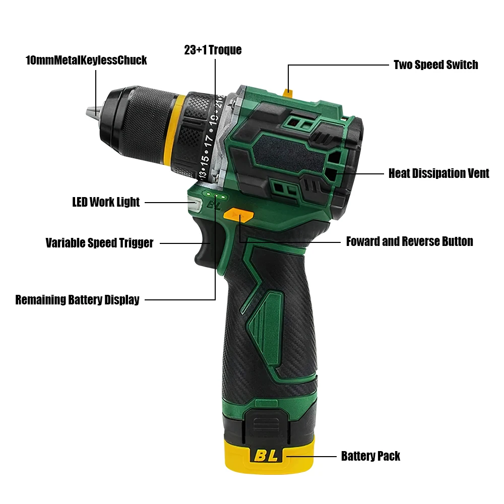 Aparafusadora/Furadeira de Impacto sem Escovas (Brushless) TKKEACE 23+1 Torques - Motor Brushless, 1500 RPM, Mandril Metal 3/8" e Bateria 2000mAh