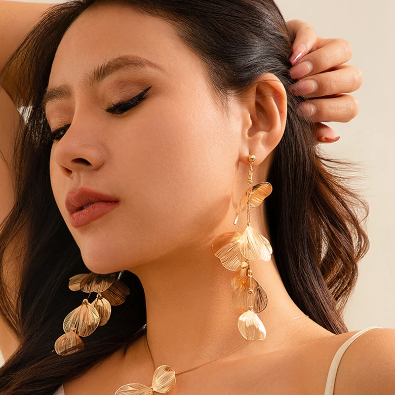 - Design de Declaração: Brincos longos com flor grande e franjas fluidas num estilo boho e vintage.