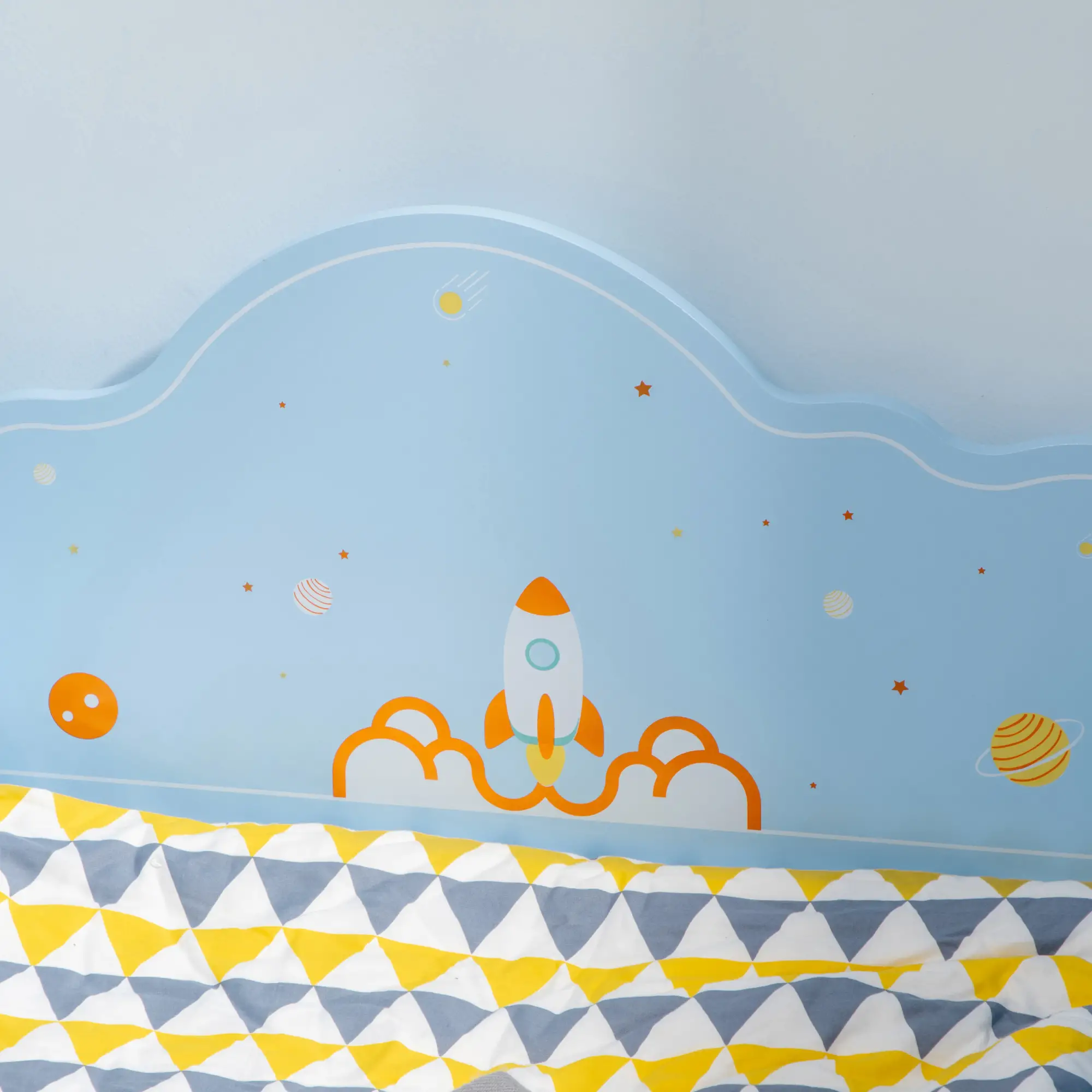 - - Cama infantil azul com uma linda estampa com motivos espaciais, com um foguete na cabeceira e um planeta no pé da cama