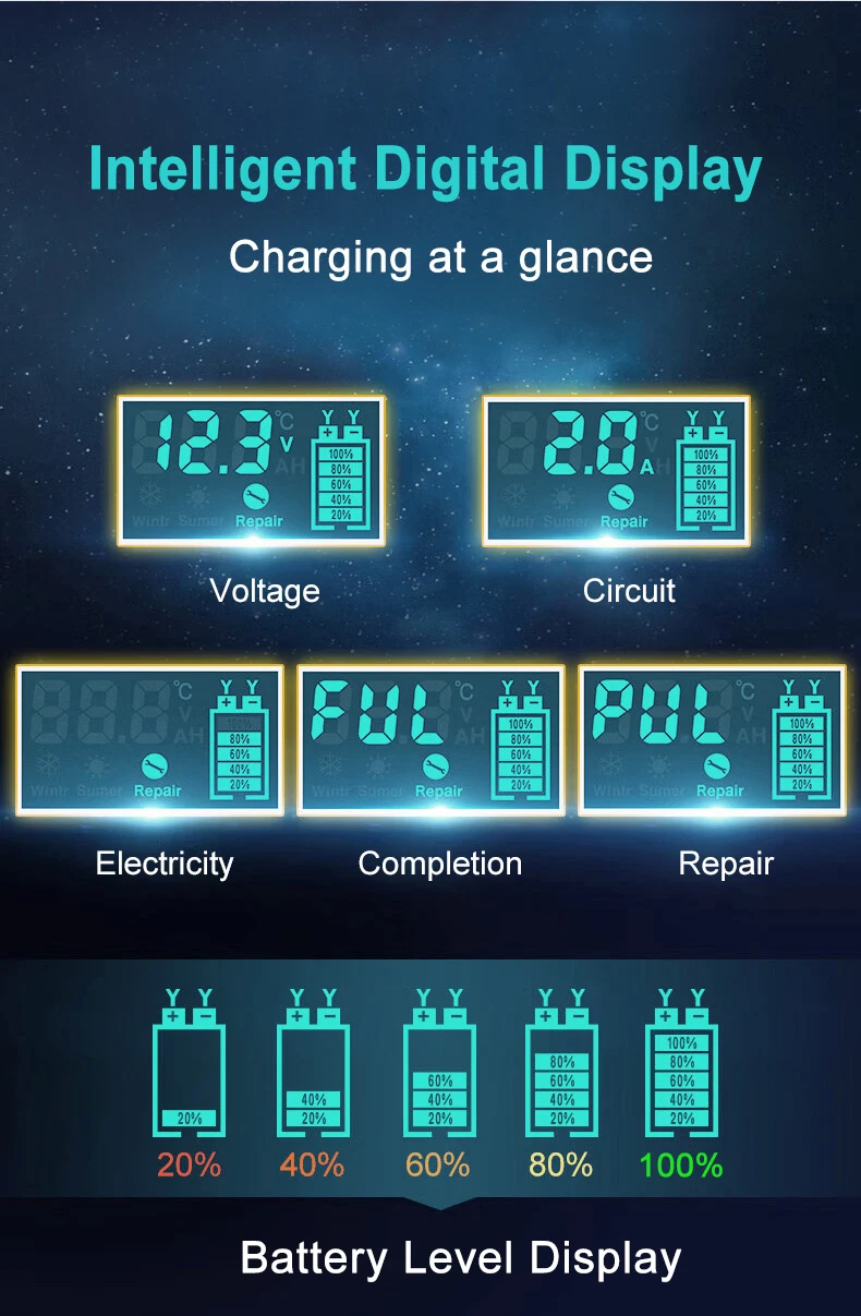 Carregador de Bateria Automático 12V 8A | Para Baterias Chumbo-Ácido, AGM, GEL e LiFePO4 | Com Reparo por Pulsos e LCD