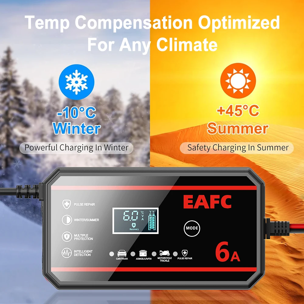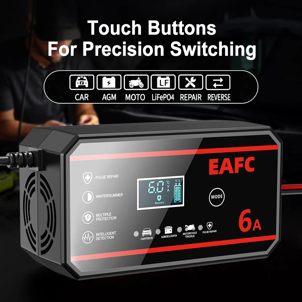 Mantenha a bateria do seu carro, moto, barco, trator ou sistema de energia sempre em plena carga e saúde com o Carregador Inteligente EAFC 12V 8A/6A. Este carregador automático de última geração, controlado por microprocessador, é projetado para ser a ferramenta definitiva para manutenção, carga rápida e até recuperação (reparo por pulsos) da maioria das baterias de 12V do mercado.