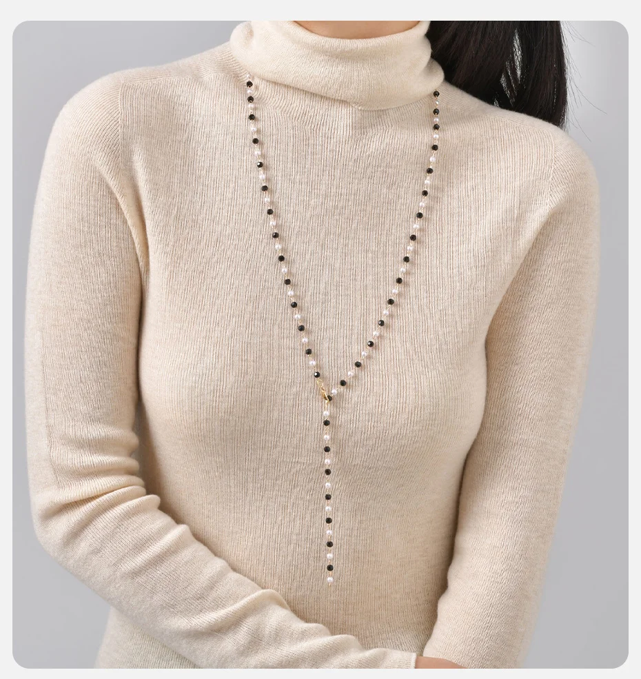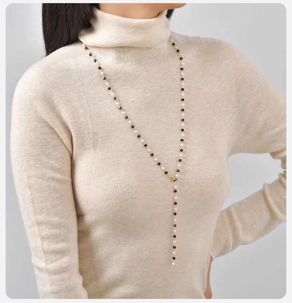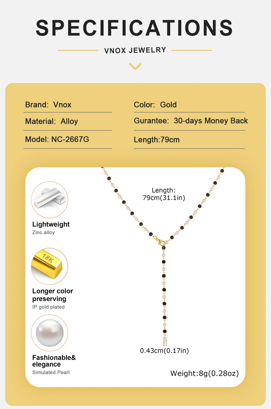 Adicione um toque de elegância dramática e sofisticação ao seu visual com este Colar Longo em Formato Y com Contas Pretas e Pérolas Falsas. Confeccionado em liga de zinco de alta qualidade e banhado em dourado fosco, este colar apresenta um design em formato "Y" com uma combinação deslumbrante de contas pretas texturizadas e pérolas falsas brilhantes, criando um contraste visual cativante. Com 79 cm de comprimento, ele cai graciosamente no decote, sendo perfeito para camadas ou uso como peça única.