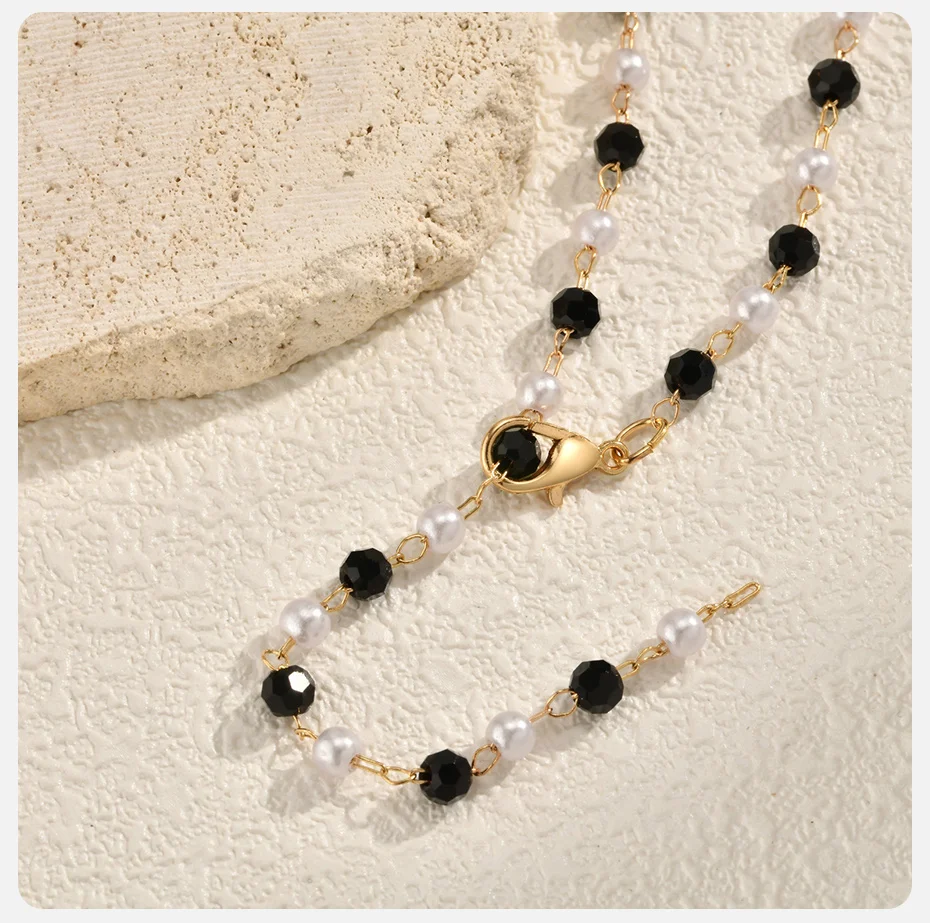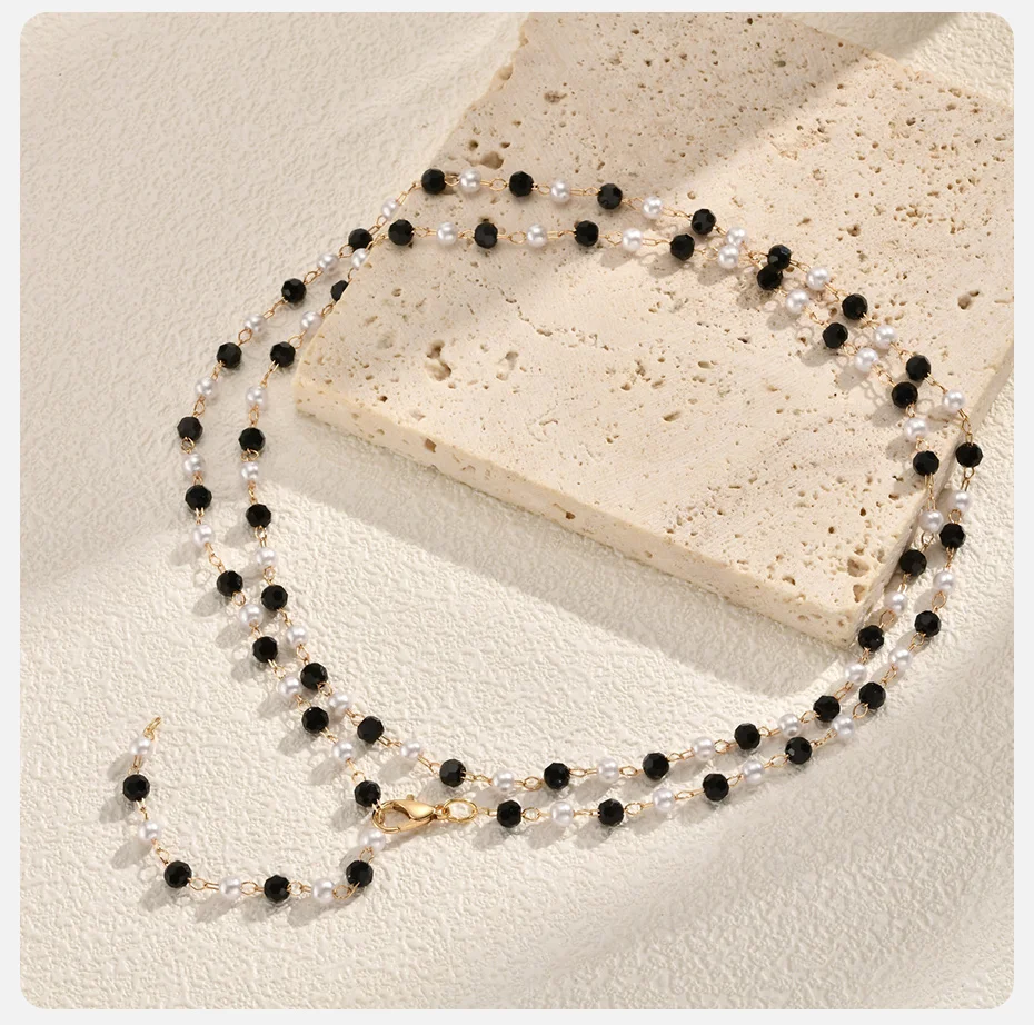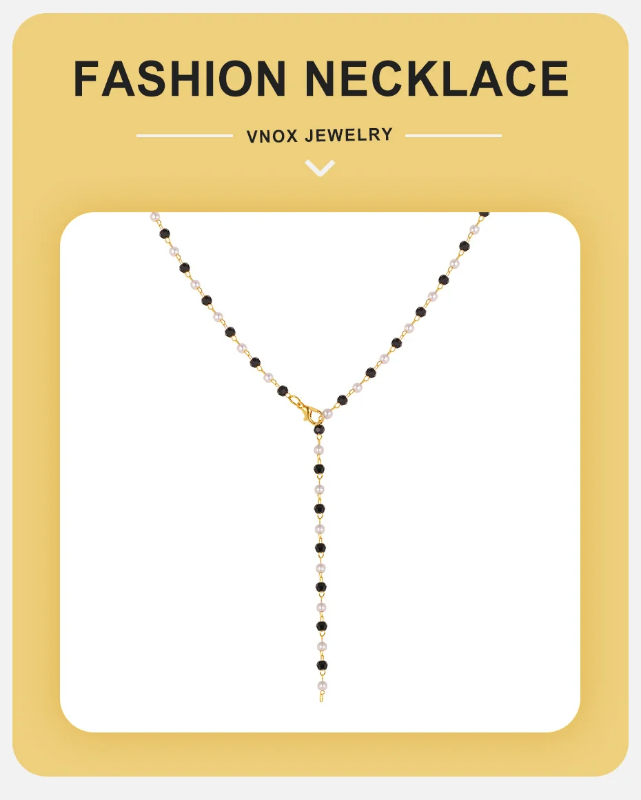 Colar Longo em Formato Y com Contas Pretas e Pérolas Falsas | Colar Feminino Banhado a Ouro Dourado - Presente Romântico e Fashion