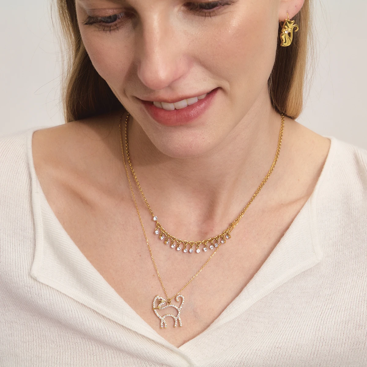 Colar Pingente Gato Linear Vazado com Strass Branco | Colar Feminino Banhado a Ouro 18K PVD com Corrente O-Chain