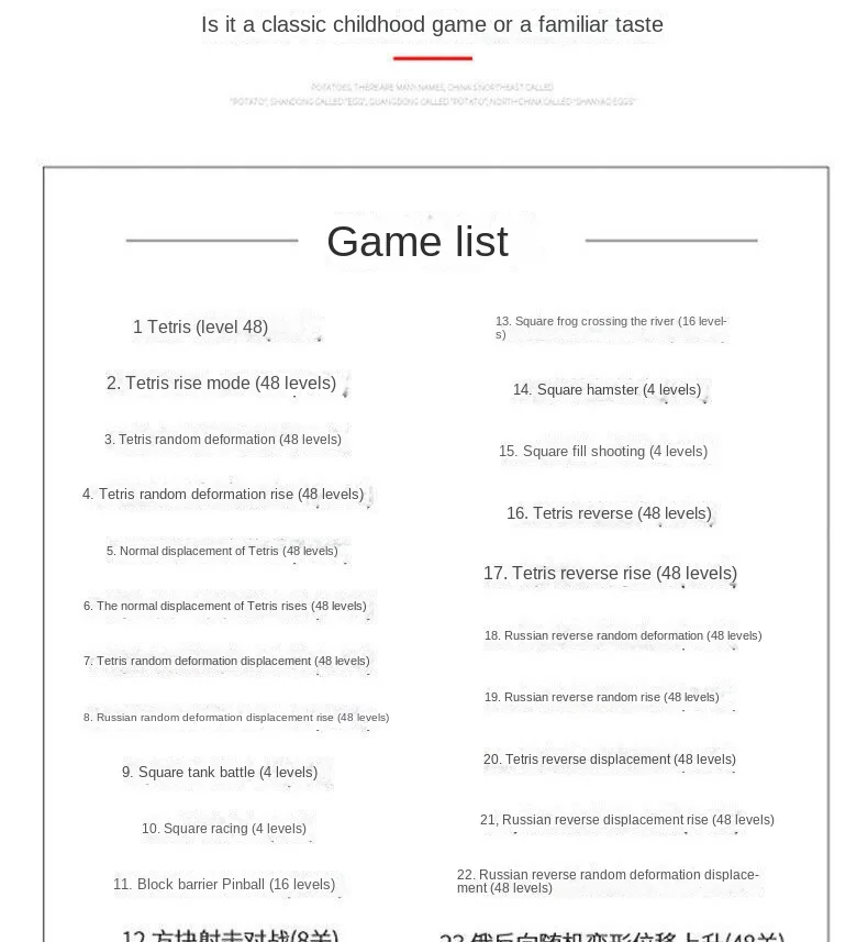 - Jogos Incluídos: 23 jogos (listados na descrição, incluindo Tetris, Tank, Racing, etc.).