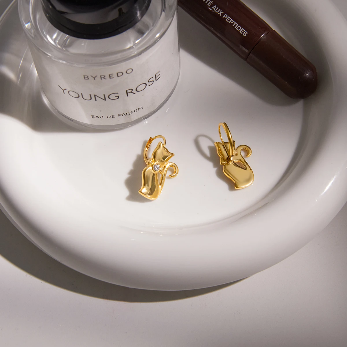 Cat-shaped pendant earrings with white rhinestones | Delicate women's earrings plated in 18K gold - Cute and elegant gift