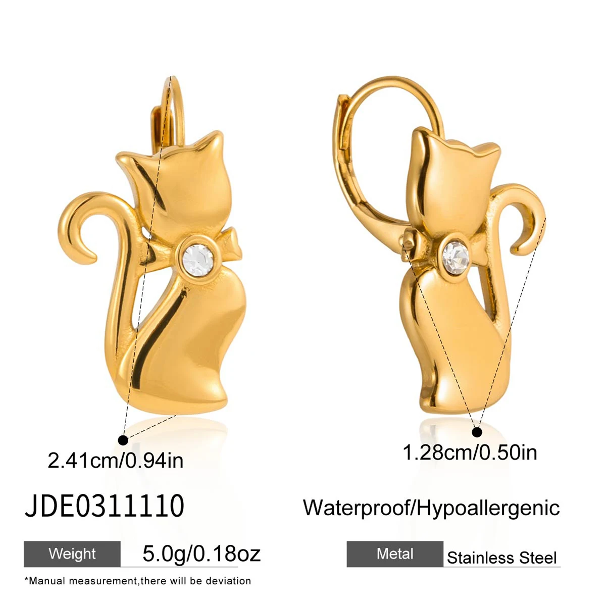 Be enchanted by the cuteness and elegance of these Cat-Shaped Pendant Earrings with White Rhinestones, a delicate piece of jewelry that combines feline charm and sophistication. Made of high-quality stainless steel and plated in 18K gold, these earrings feature cat-shaped pendants adorned with sparkling white rhinestones, creating a captivating look full of personality.