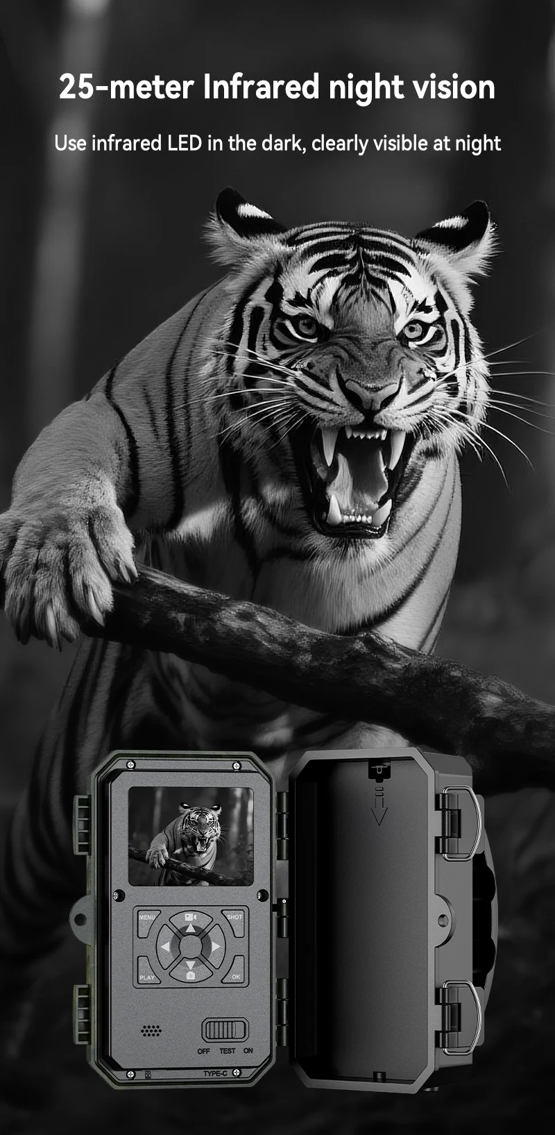 - 25m Infrared Night Vision: Inconspicuous IR LEDs illuminate the scene in total darkness, capturing crisp black and white images without startling animals or alerting intruders.