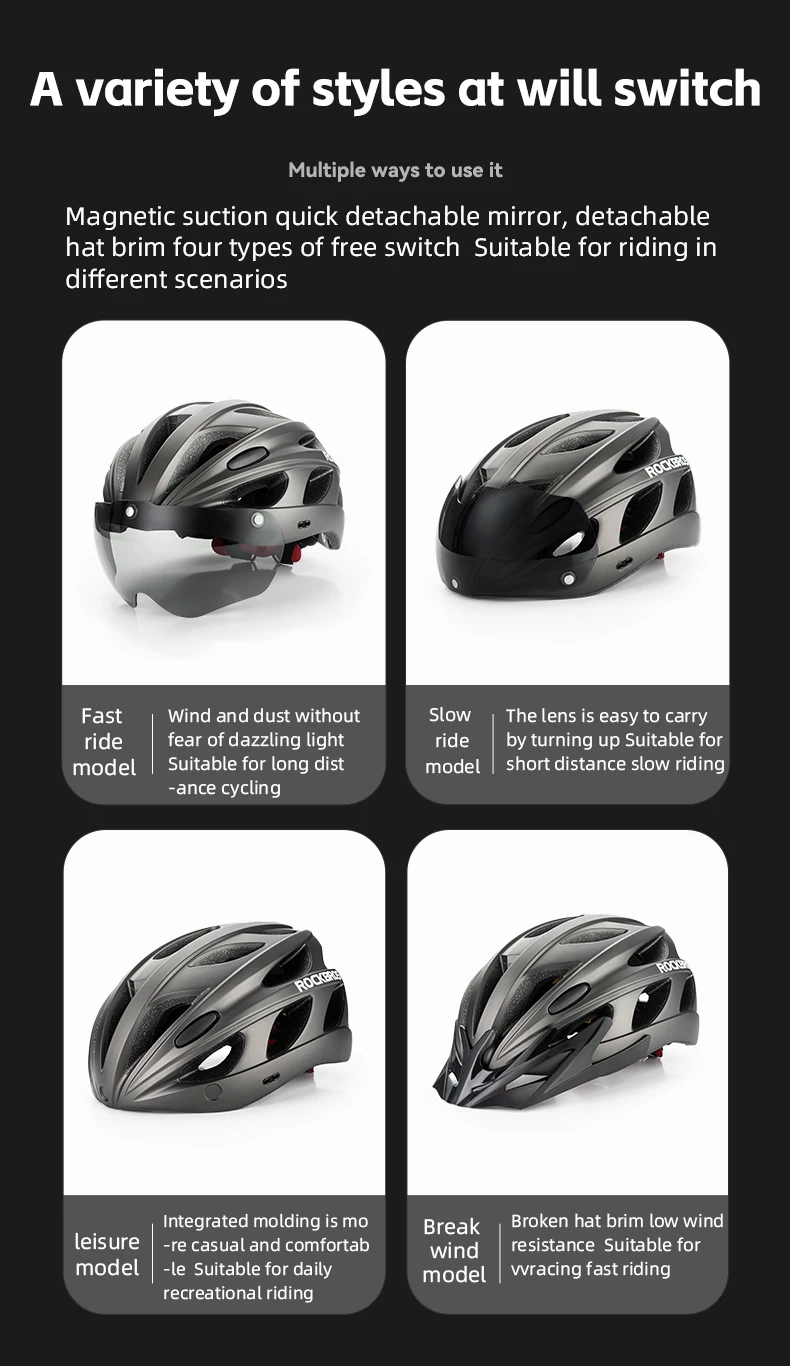 Protect yourself with lightness and clear vision in all conditions with the ROCKBROS TT-16-TI Cycling Helmet . This helmet stands out for including a high-quality visor (photochromic or polarized) that automatically adapts to light intensity or eliminates reflections, offering superior eye protection without the need for separate sunglasses.