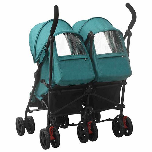Simplify your routine with this green steel twin stroller, designed to make parenthood easier and more practical. This twin stroller is ideal for walks in the park, family shopping trips, or overseas travel, thanks to its functional and robust design. The 4-position adjustable backrest and adjustable footrest ensure maximum comfort for each child. The foldable canopy offers effective protection against the sun and UV rays, while the included basket allows you to store diapers, blankets, or toys in an organized way. With a smooth one-hand folding mechanism, this twin stroller is easy to transport and store, making it the perfect companion for dynamic families.