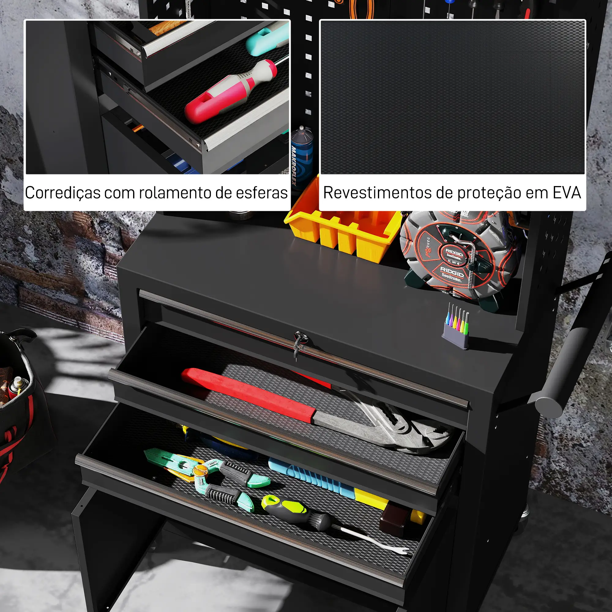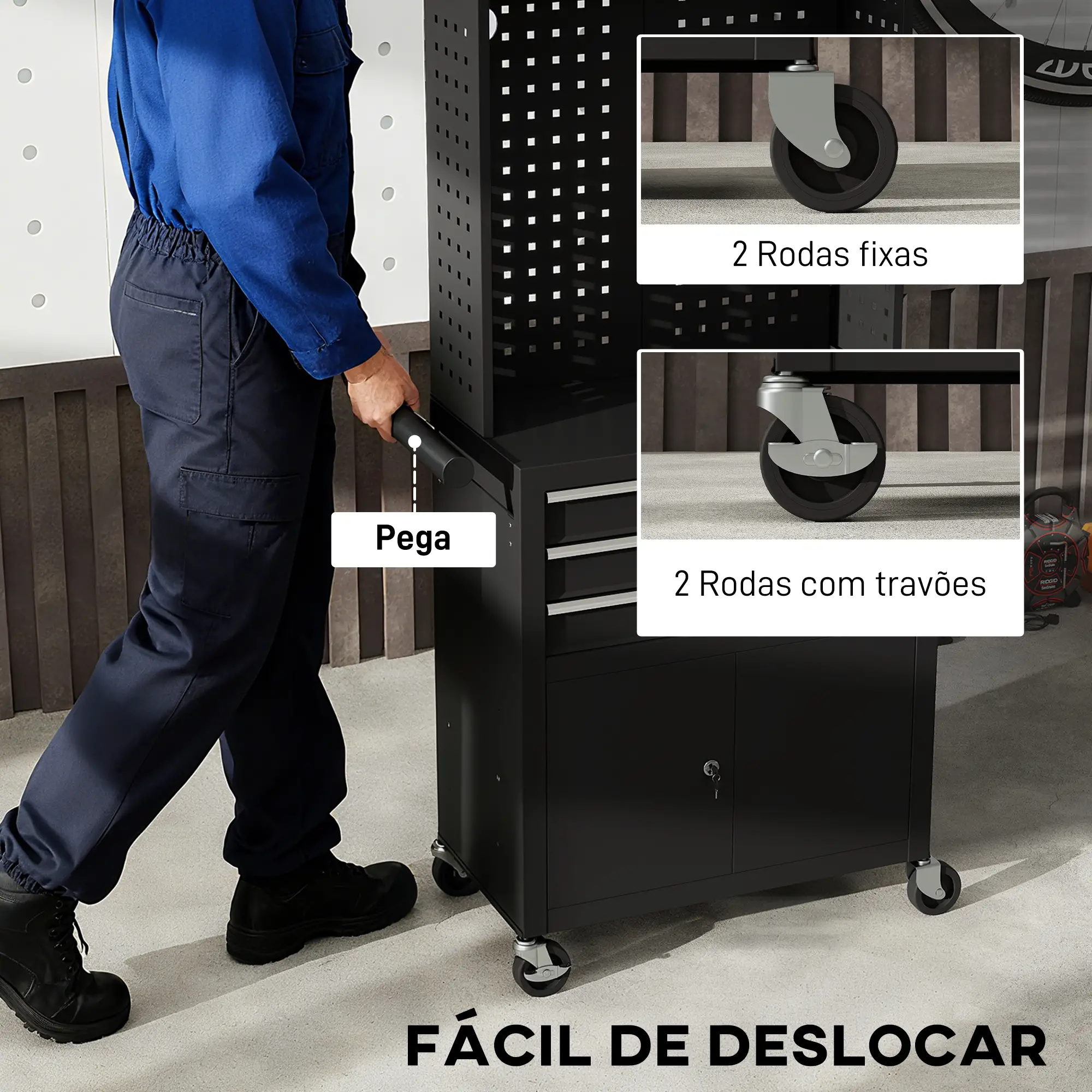 Organize and transport your tools with maximum efficiency and safety with the HOMCOM Tool Cart with Perforated Panel . This versatile cart combines multiple storage solutions: 3 spacious drawers for small tools and accessories, a rear perforated panel (pegboard) with included hooks for hanging larger tools in a visible and accessible way, and an adjustable top shelf for bulky items.