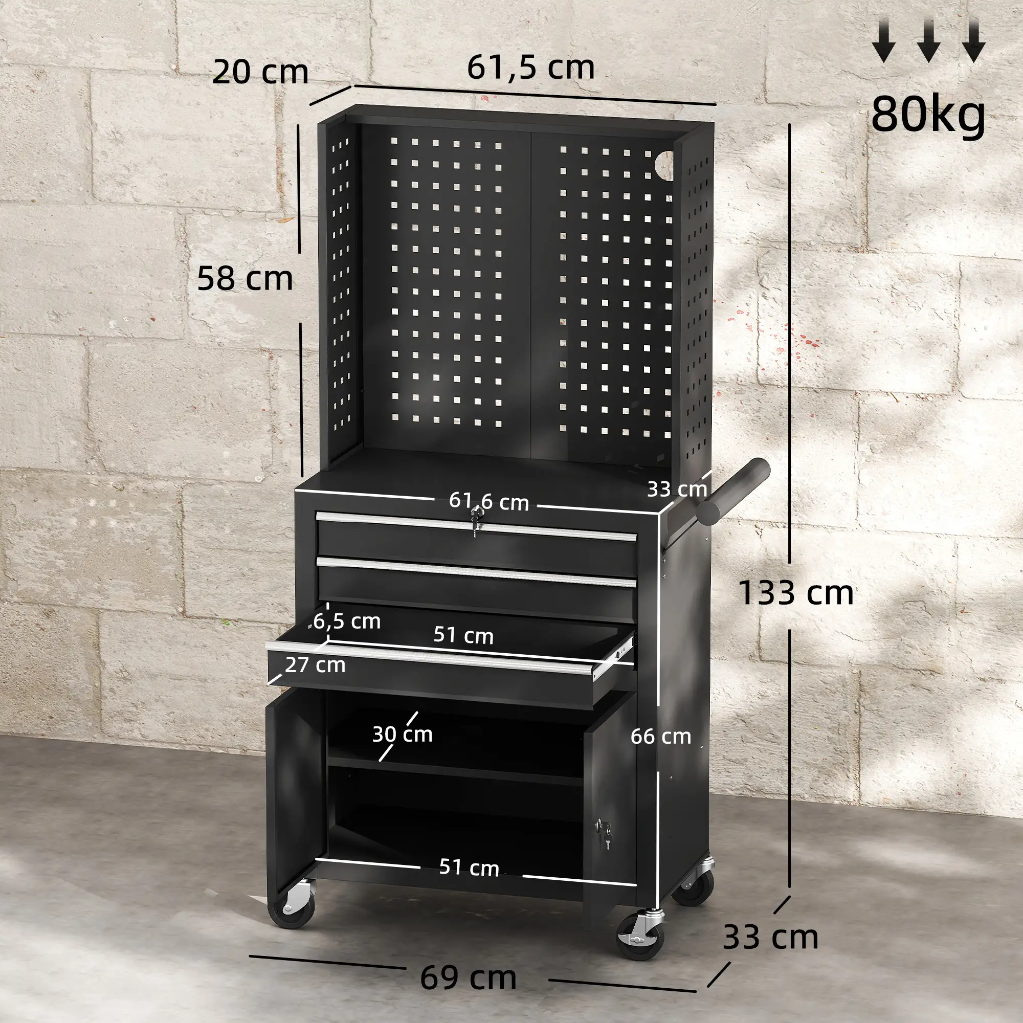 HOMCOM Tool Cart with 3 Drawers, Perforated Panel and Lock - Mobile Organizer with Adjustable Shelf and 2 Wheels, for Workshop or Garage