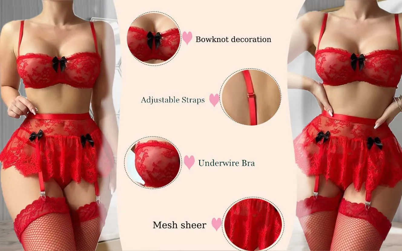 3-Piece Lace and Tulle Lingerie Set | Bandeau Top, Skirt, and Thong Panties - Valentine's Day Gift