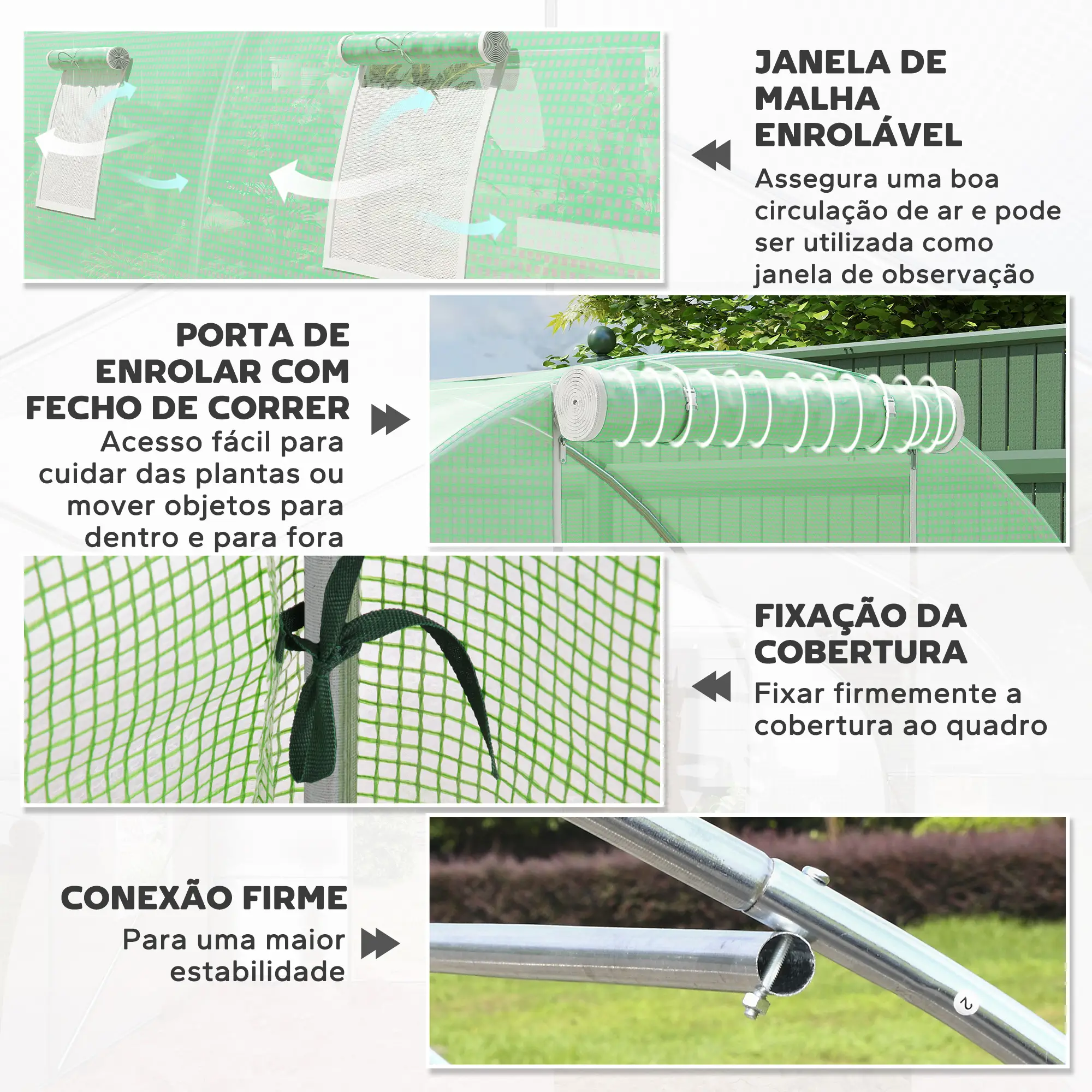The robust structure is composed of high-strength galvanized steel tubes , providing stability and durability even in adverse weather conditions. The cover is made of 0.2 mm translucent PE plastic , which maximizes sunlight entry while protecting plants from UV rays and retaining the heat and moisture essential for growth. It includes 8 side windows with ventilation screens and a wide zippered door , allowing precise control of temperature, humidity, and air circulation inside.