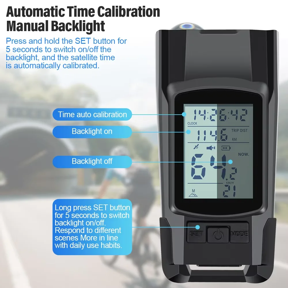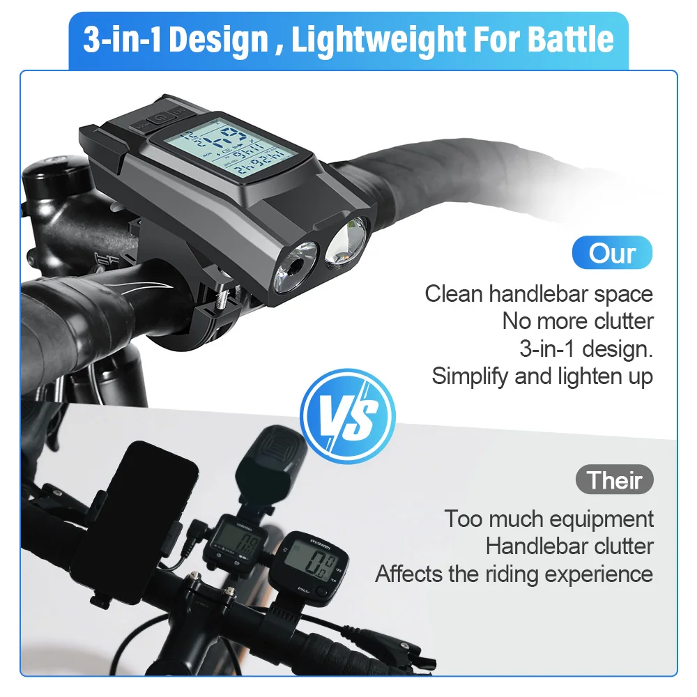 Simplify your cycling equipment and enhance your safety with the NEWBOLER 3-in-1 Bike GPS . This innovative device combines three essential features in a single compact handlebar-mounted product: a bike computer with accurate multi-satellite GPS , a powerful 800-lumen LED headlight , and a high-intensity horn (120dB) , eliminating the need for multiple accessories.