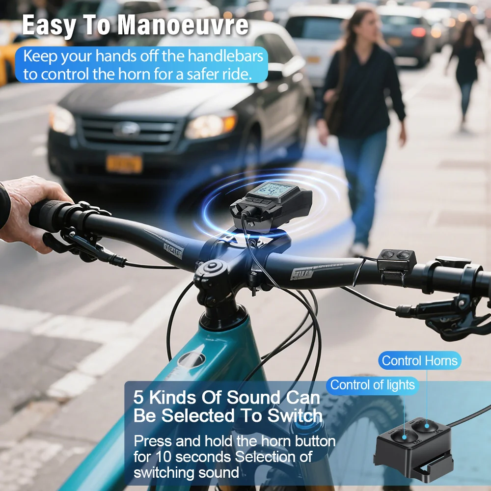 The GPS tracks and displays real-time speed, distance, time, altitude, and calories , with automatic time synchronization via satellite . The headlight offers 4 lighting modes (including an anti-glare beam) to adapt to any condition. The horn with 3 different sounds (including a siren) effectively alerts vehicles and pedestrians. Powered by a 4000mAh battery with USB charging, it is water-resistant (IPX6) and includes a dual remote control for easy, hands-free operation.