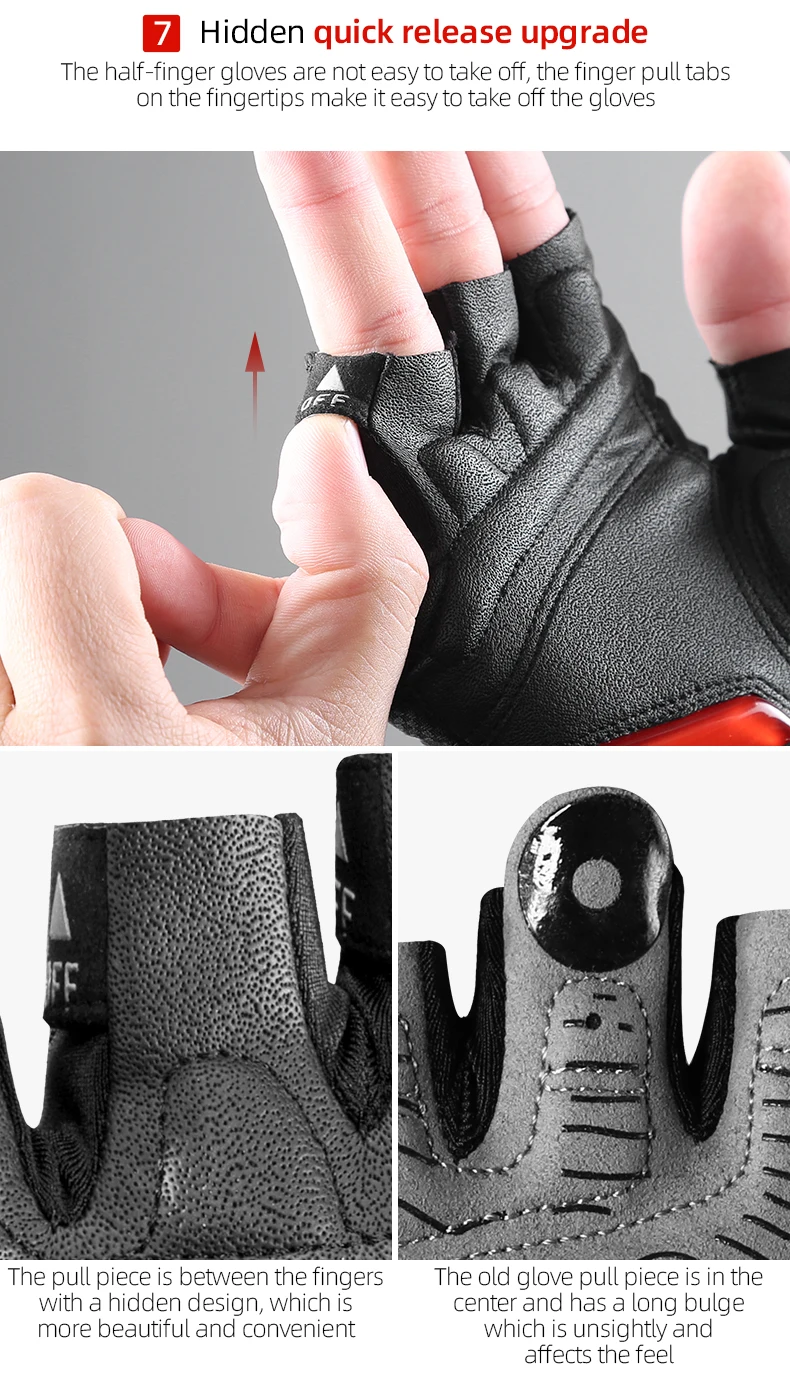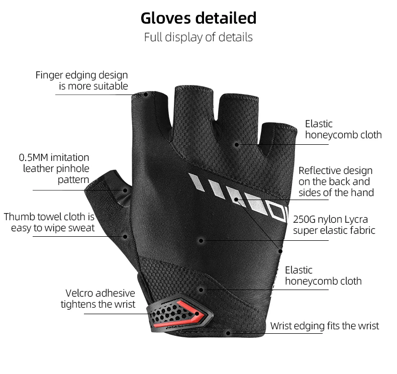 O design "half finger" (meia-dedo) proporciona uma ventilação máxima e destreza total para operar gadgets ou sentir os comandos da bicicleta, enquanto o corte "with fourchettes" aumenta o conforto e a liberdade de movimento. O seu design unissexo e ajuste ergonómico adaptam-se perfeitamente a homens e mulheres.