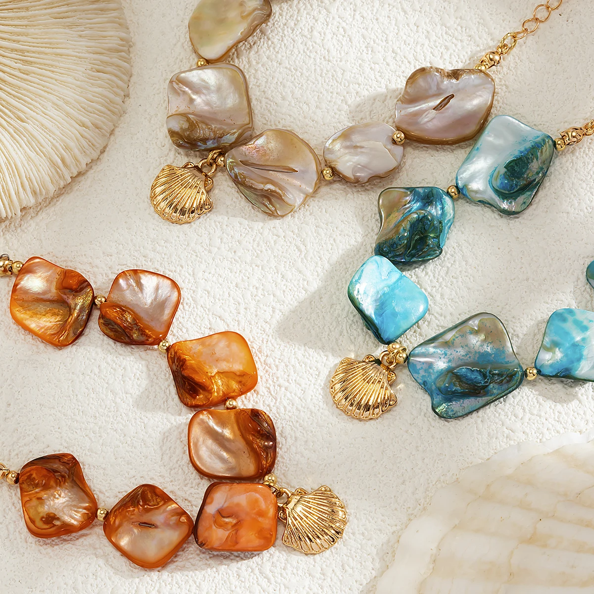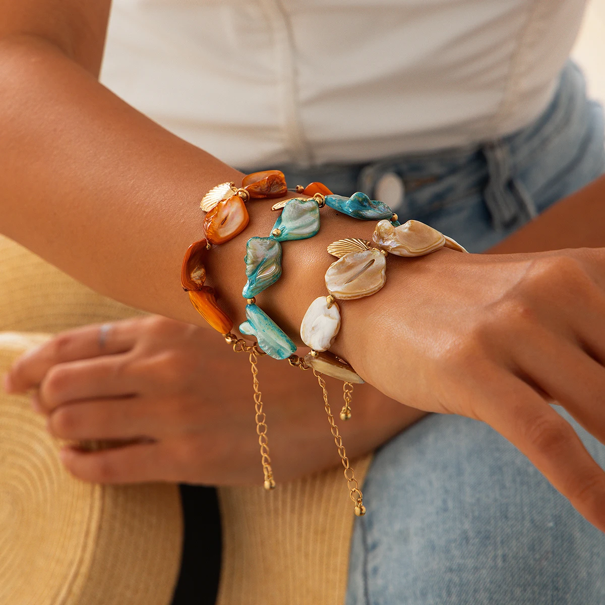 This multicolored irregular chain bracelet is a celebration of free-spirited boho style and the vibrant trends of Y2K and Kpop . Combining faux white pearls, blue and orange crystal details, a charming shell pendant, and a decorative "OT Buckle" clasp , it's a hand accessory full of personality and color to create unique looks .