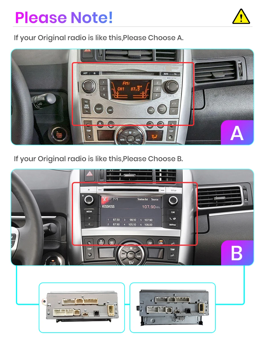 - Version A vs. Version B: You MUST select the correct version at the time of purchase, based on your car's original console.