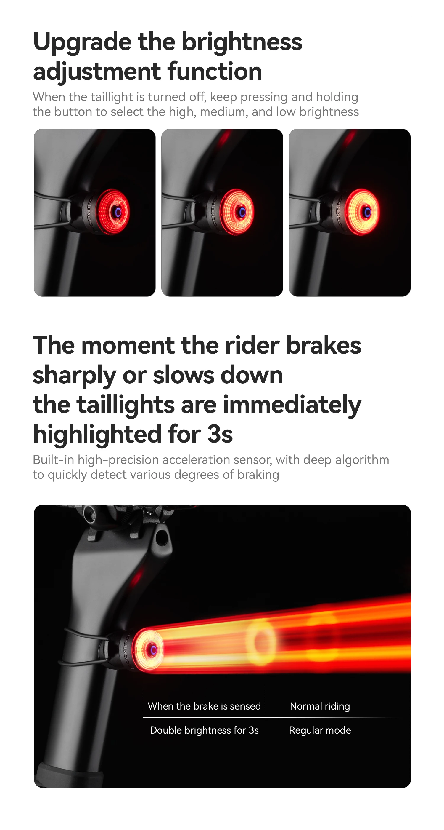 Introduza um novo nível de segurança inteligente nas suas viagens com a Luz para Bicicleta ROCKBROS R0. Esta luz inovadora não é apenas um farol de aviso; é um sistema de comunicação ativa. O seu sensor de travão e vibração integrado (Smart Brake) deteta automaticamente quando você diminui a velocidade ou trava, mudando instantaneamente a cor da luz (por exemplo, de vermelho contínuo para vermelho brilhante intermitente) para alertar os condutores atrás de si de forma mais clara e urgente.
