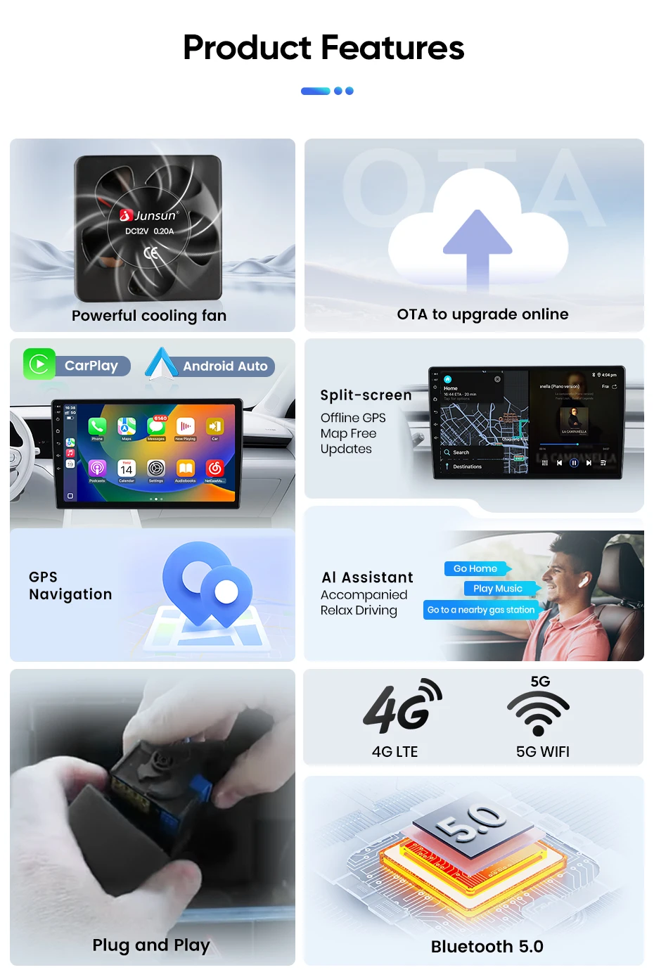 - Conectividade: Wireless CarPlay & Android Auto, Bluetooth 5.0, Wi-Fi Dual-Band, 4G LTE Ready (via dongle), GPS + Glonass