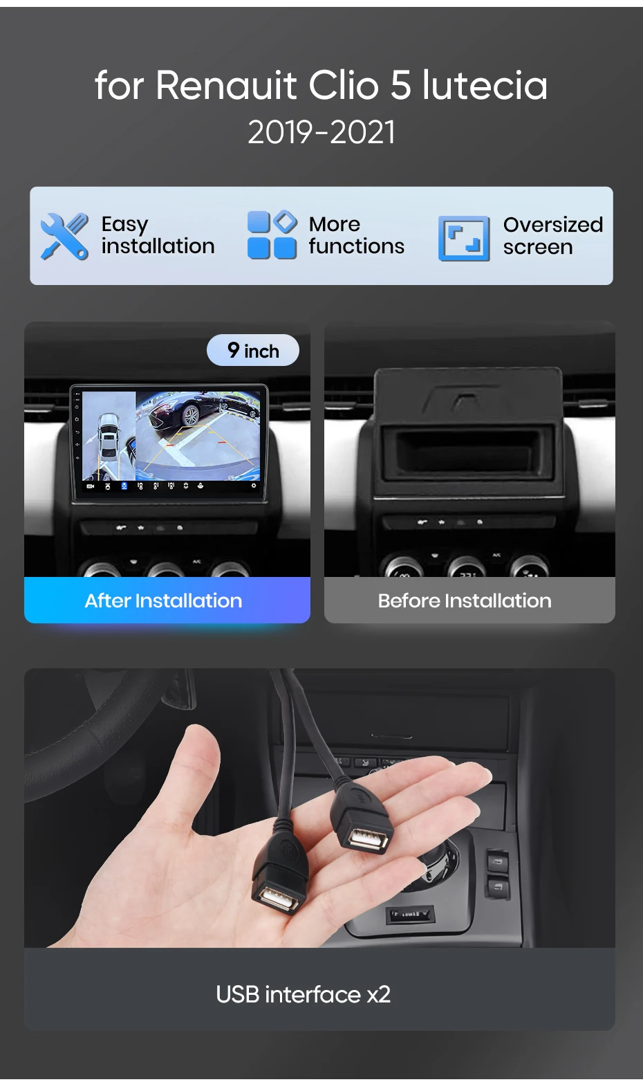 - Desenvolvido especificamente para o Renault Clio 5/Lutecia (2019-2021). Mantém controles no volante, CAN-BUS, e interface do veículo.