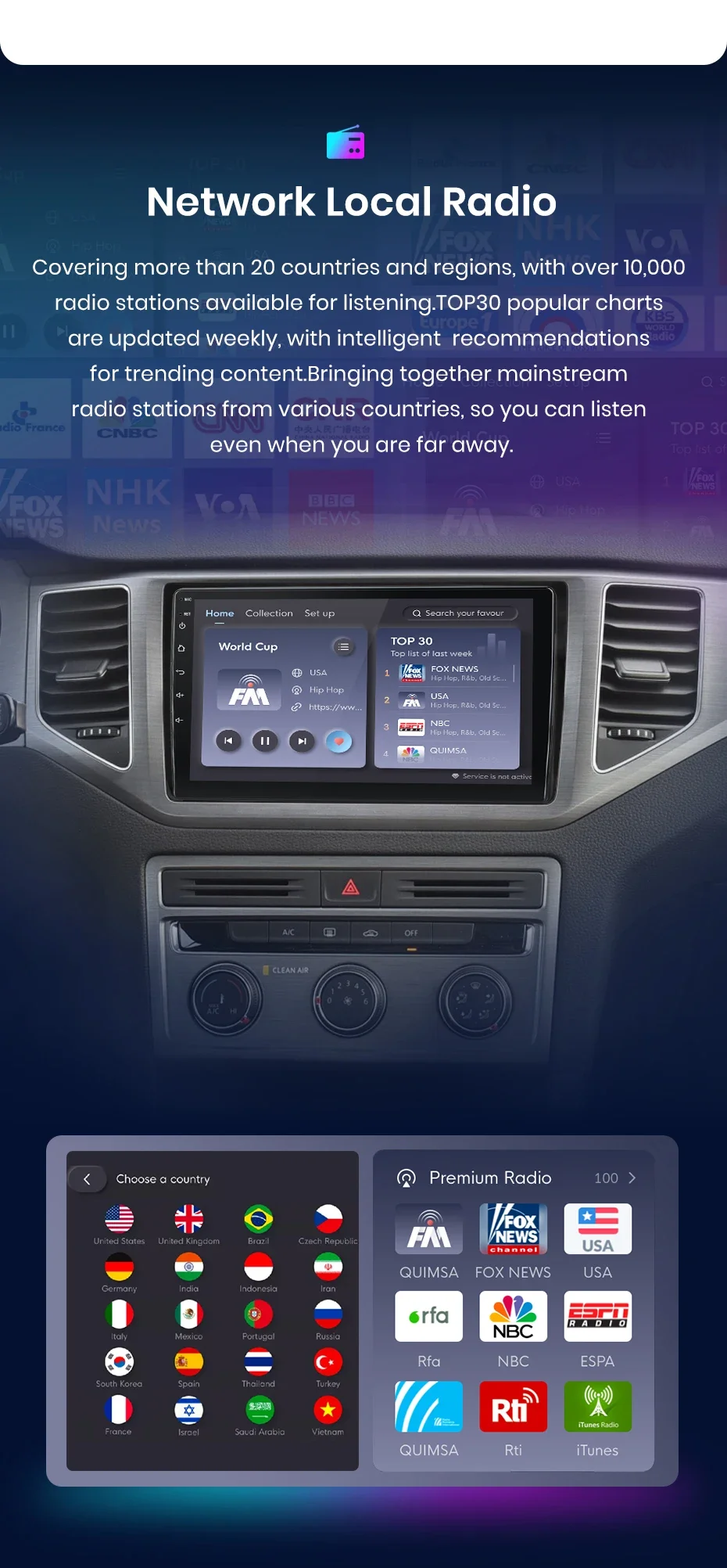 3, Advanced voice control: Control radio by voice, improve driving safety;