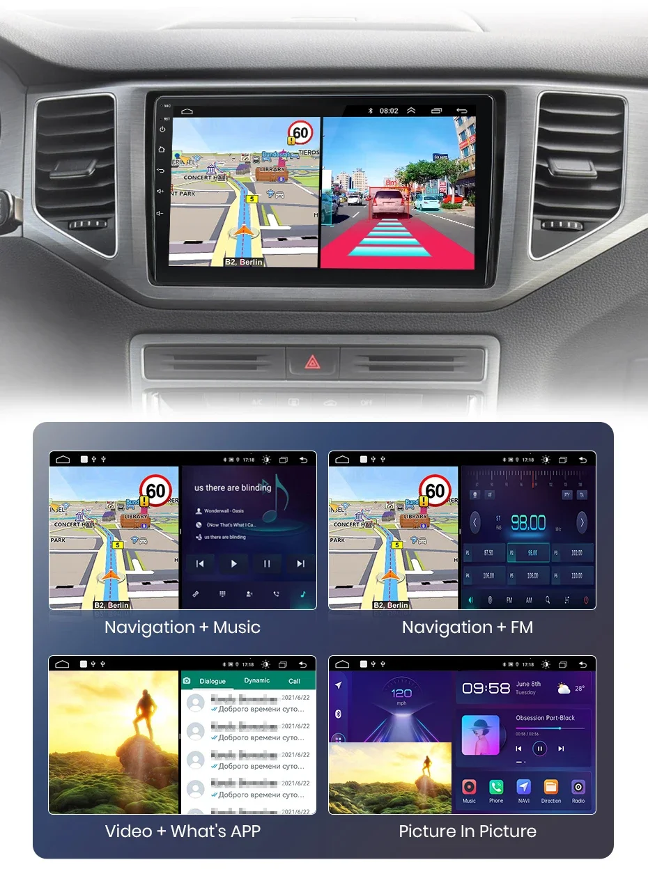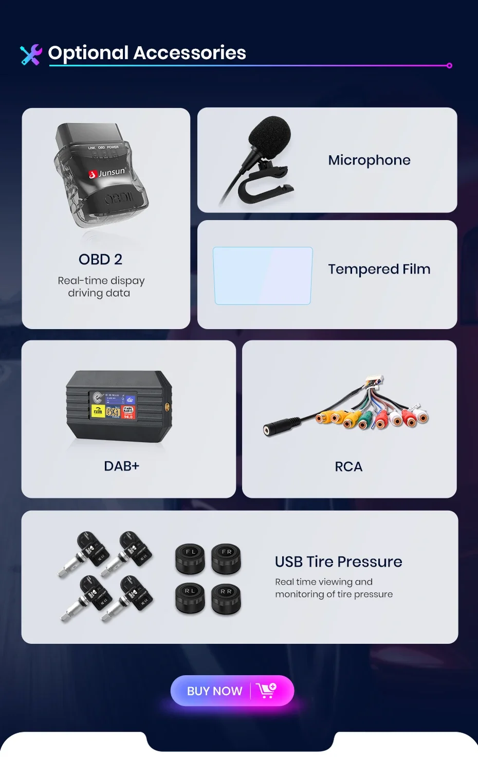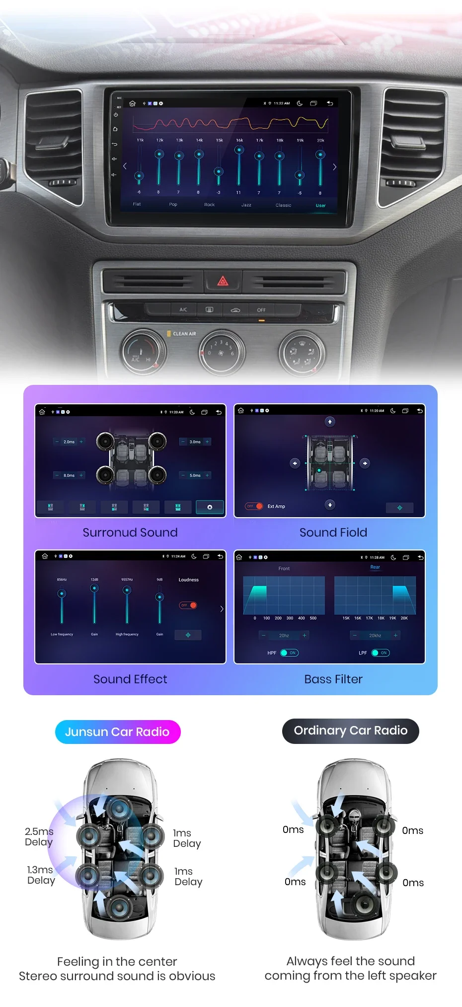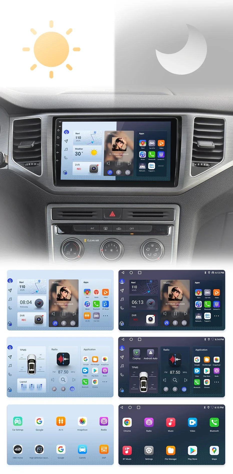 The radio will switch between day and night modes using car headlights to adjust the overall brightness of the screen to match the surrounding environment. Common functions are integrated into the desktop, enabling you to switch between navigation, music, Bluetoo-th calls, and other common features with just one click. Junsun's personalized UI design enhances convenience and safety throughout your journey;